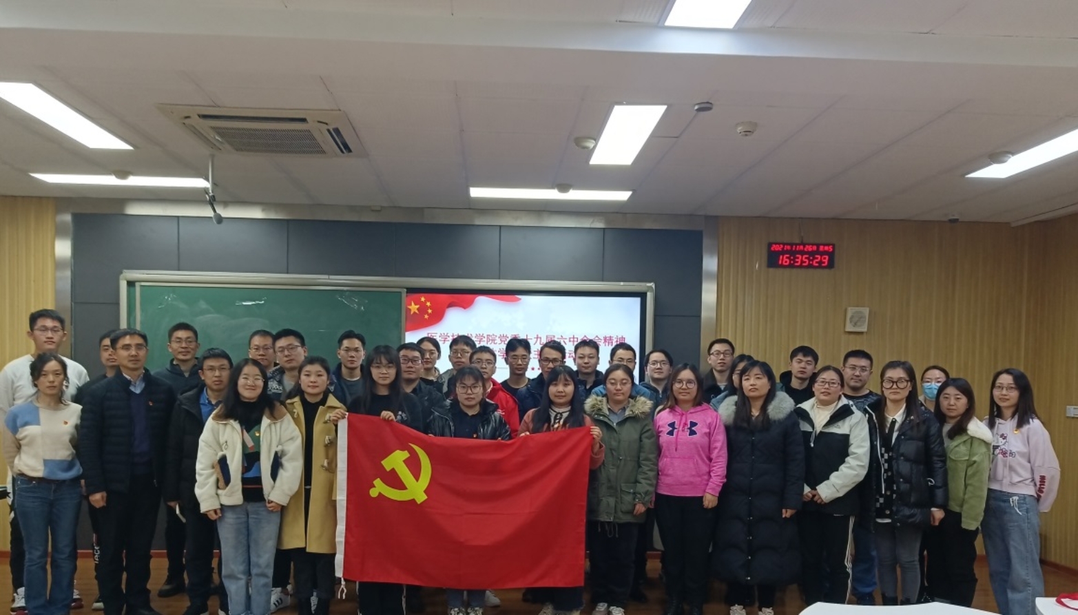 2021年11月26日,医学技术学院党委举办十九届六中全会精神集体学习暨主题活动。医学技术学院党委书记周勇做专题辅导学习。党委副书记、副院长章涛主持,全体师生党员、积极分子参加。